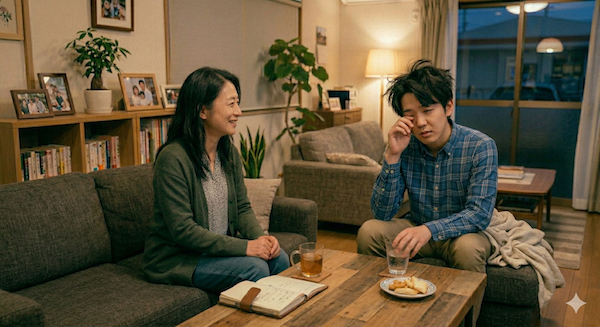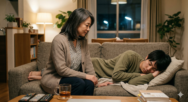 ソファで伸びをした永が、「母さん、何見てるの」と照れくさそうに言う。